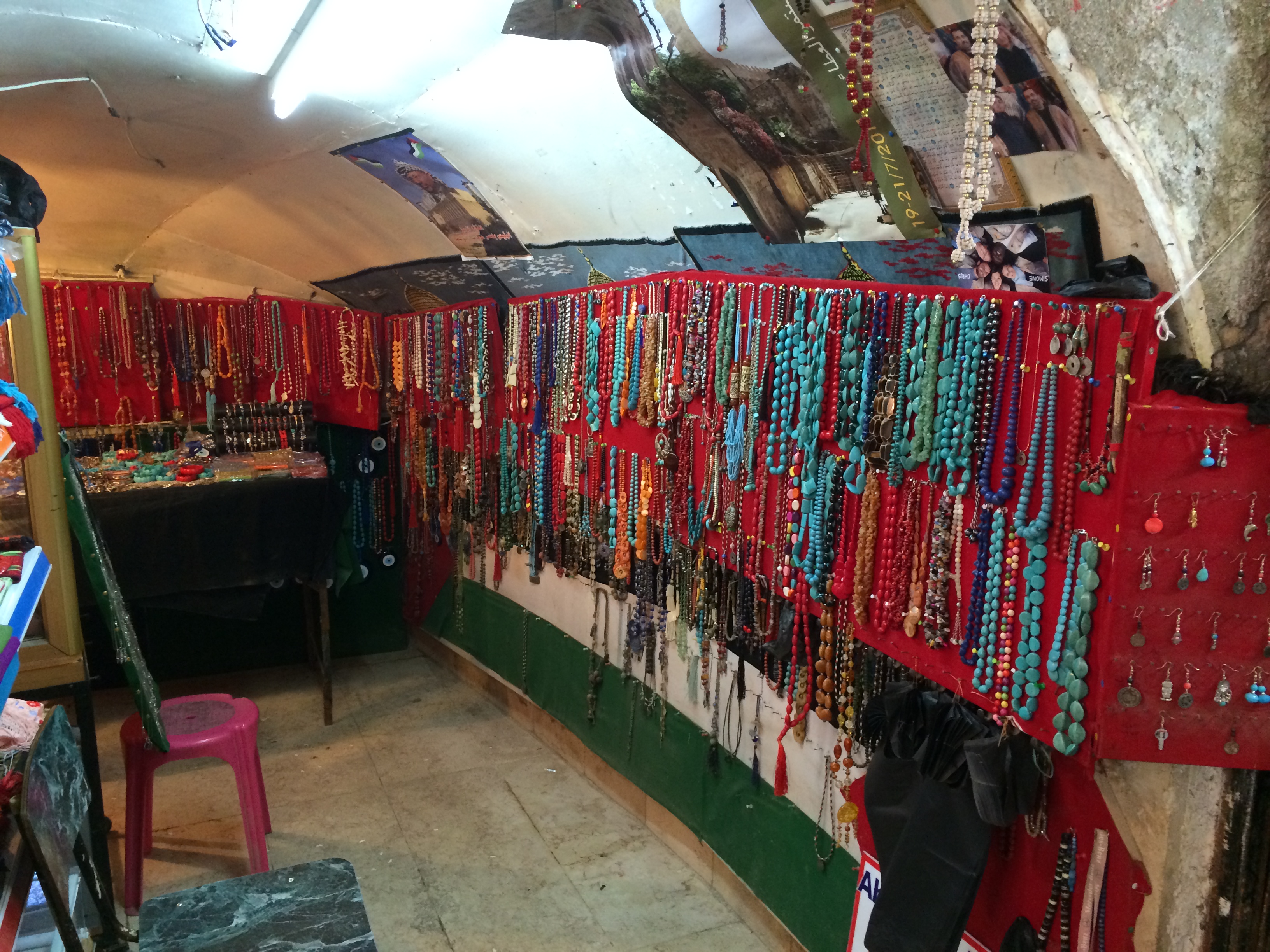 When Sami from HRC gave us the tour of the old town on the first day of work, he had introduced us to Laila. She served us tea and Sami told us how she vents her frustration at at the occupation by keeping her hands and mind busy making jewelry. One of the specialties are earrings made from pre-Israel, Palestinian coins. I finally chose a pair for myself today – yippee! She also sells keffiyas in every imaginable color, all loomed right here in Hebron.