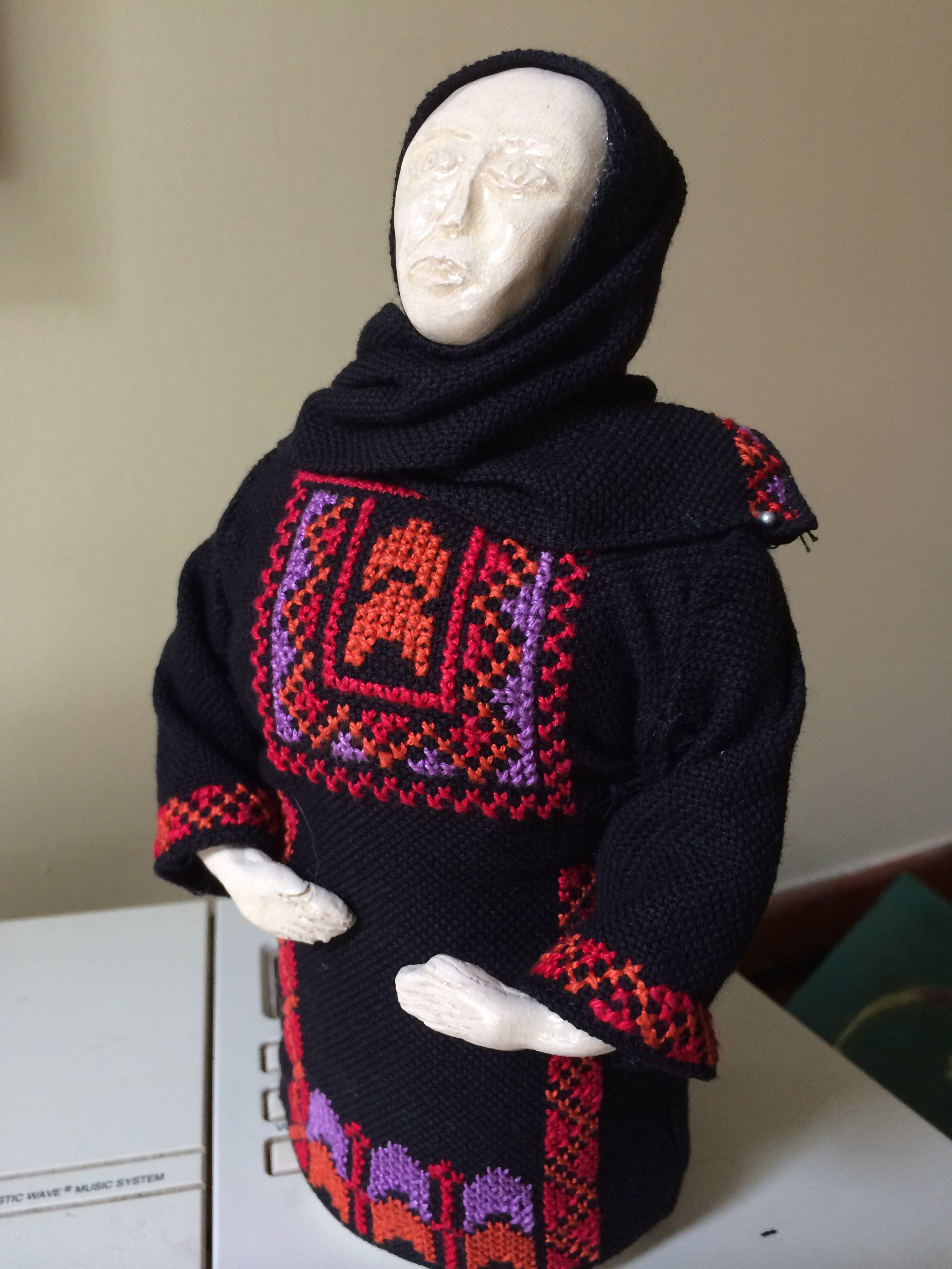 She’s a handmade clay figurine with a the traditional dress worn by older Palestinian women adorned with the classic cross-stitched embroidery. I had actually had my eye on it last year, but didn’t think I’d have the space to bring her back safely. Fortunately, she waited for me and I was able to bring her home this time.