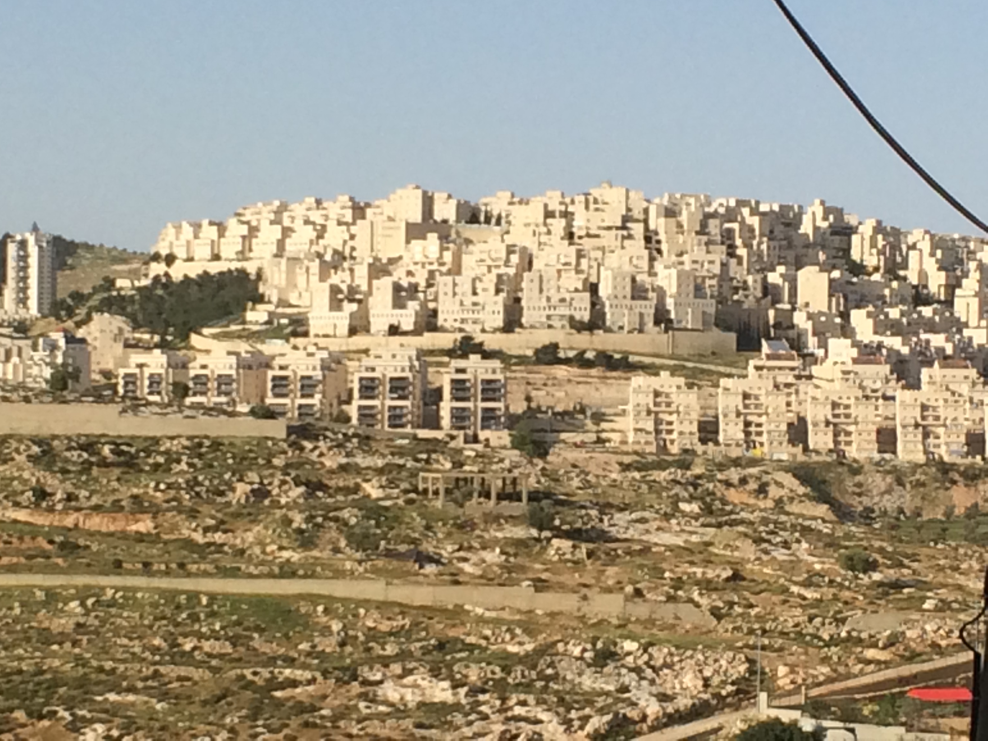 But, that’s not all. There are three large settlements that surround Bethlehem and are further encroaching on it. I have shown pictures of Har Homa which overlooks my neighborhood. They always build the settlements on high hills, giving them the advantage of being able to look down on the Palestinians in a siege sort of mentality. Imagine the feeling of the Palestinians having to constantly look up at them. These modern metropolises that are so out of place in the environment, secured by tall cement fences and with roads on which only Israelis are allowed, dissecting farms and villages.