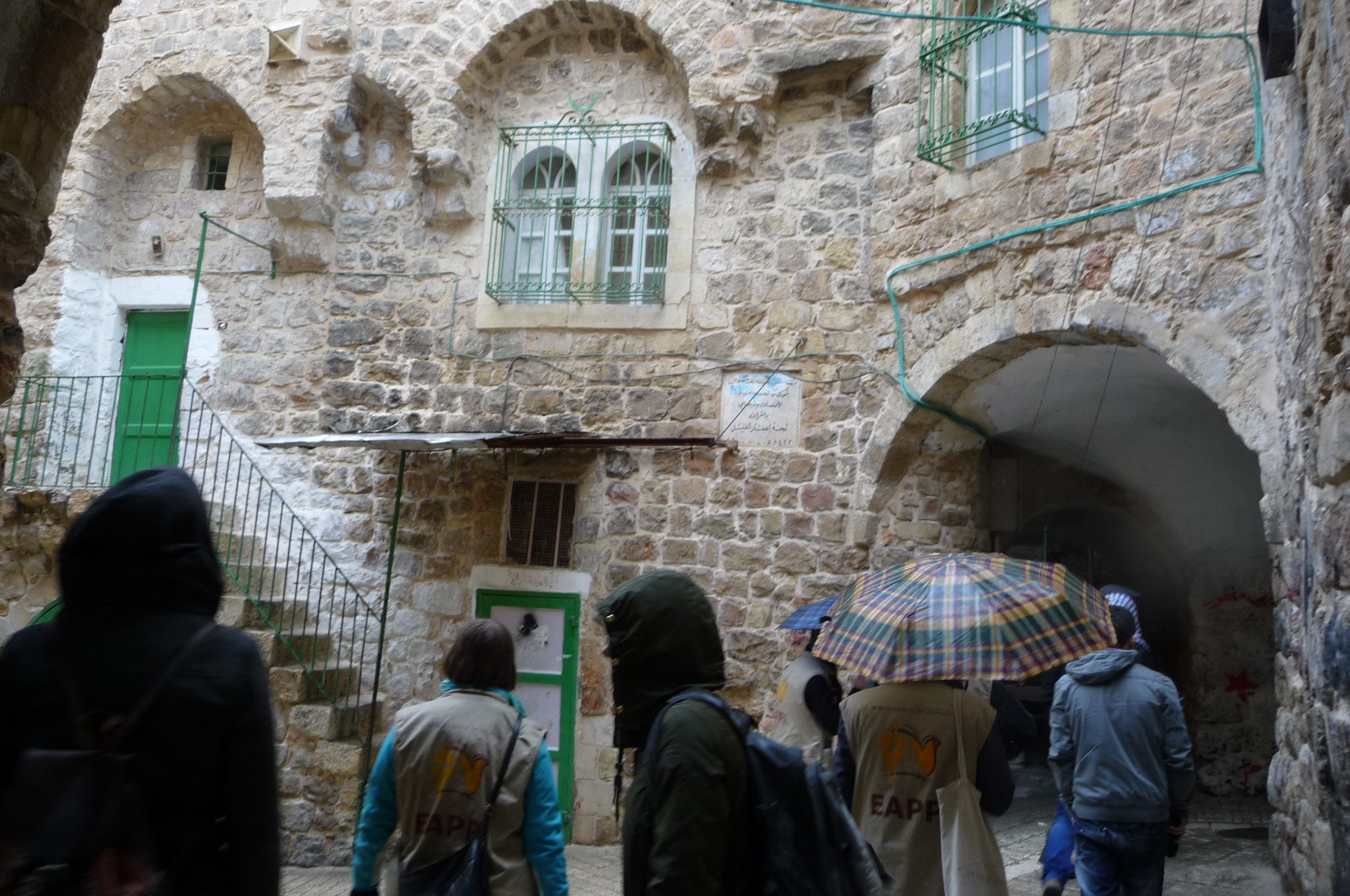 Wednesday was my first day of work at the Hebron Rehabilitation Committee (HRC). It was a cold, rainy day, the first of this kind of weather I’ve experience in the Holy Land. I couldn’t see a lot during the drive from Bethlehem to Hebron because it was so foggy, but there was a certain ethereal beauty with the fog in the craggy hills. I was greeted at the Service stop by a driver sent by HRC to take us into the old city. There were two other women in the car, one from EAPPI https://www.eappi.org/en one of the several volunteer human rights monitoring organizations and another who is also working in the legal department at HRC. We were escorted into a meeting room in HRC’s beautifully, restored, old-city building.