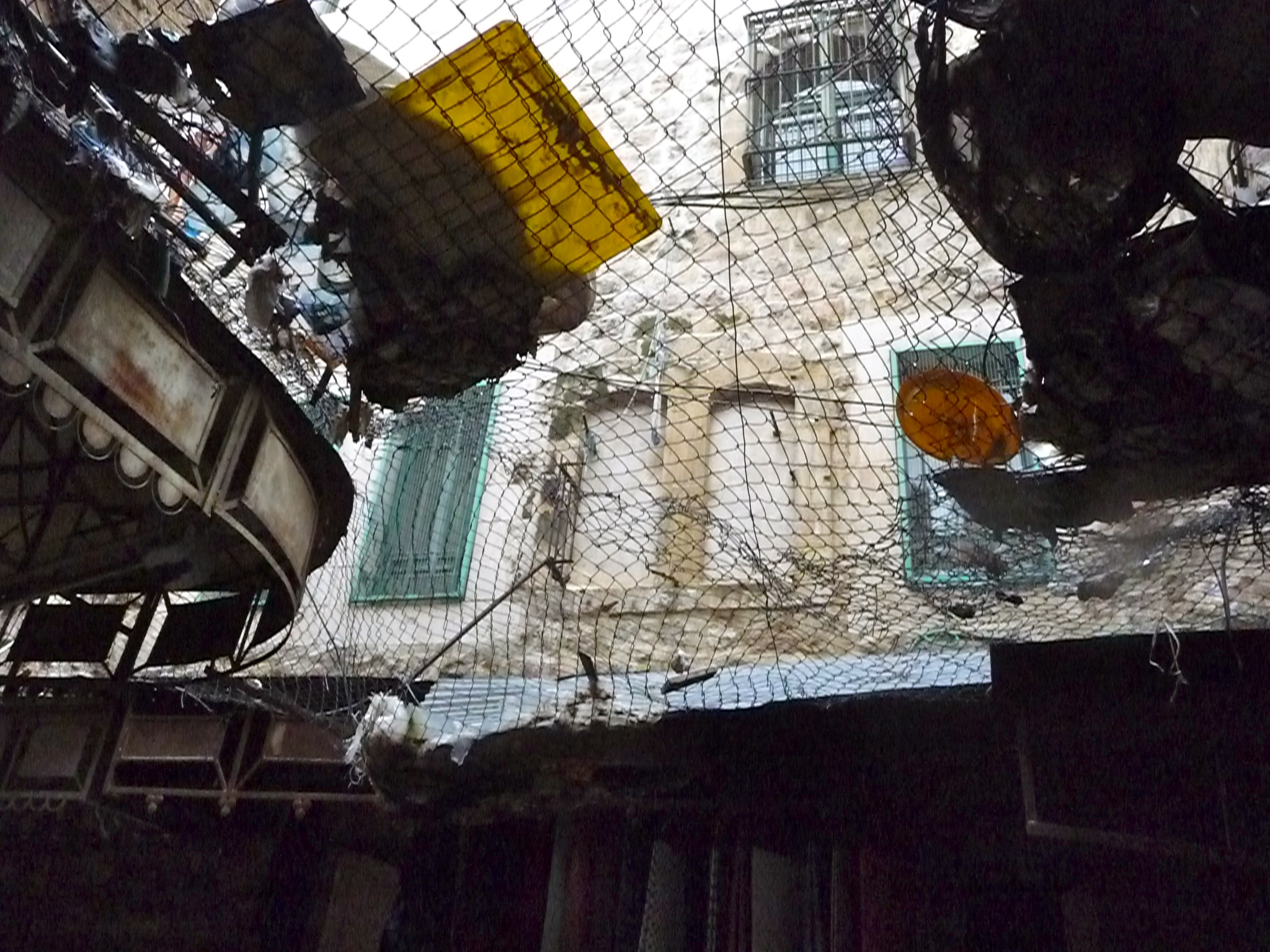 What about the Palestinians whose houses and shops face Shuhada Street? Their doors have been literally welded shut, some while the inhabitants were still inside. Some of the stalwart Palestinians who remain have constructed elaborate means of exiting through back windows, and erecting ladders to climb over roofs and get to the part of the old city in which they are allowed. As life has become unbearable for these Palestinans, many have abandoned their homes. Israeli law supposedly prohibits settlers from occupying them, but that hasn’t stopped them from trying.